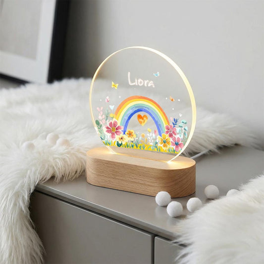 Acrylic LED night light with name, rainbow & floral design, wooden base, nursery decor, personalized kids room lamp, custom baby gift