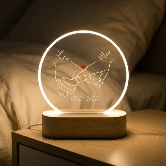 Acrylic LED night light hand holding line art, wood base, custom engraved name date, minimalist couple gift, anniversary bedside lamp