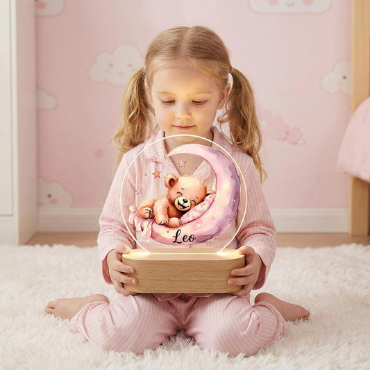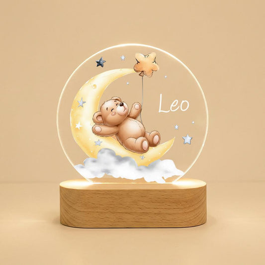 Acrylic LED Night Light, Teddy Bear on Moon, Personalized Baby Name, Nursery Decor, Kids Bedside Lamp, Wooden Base, Baby Shower Gift