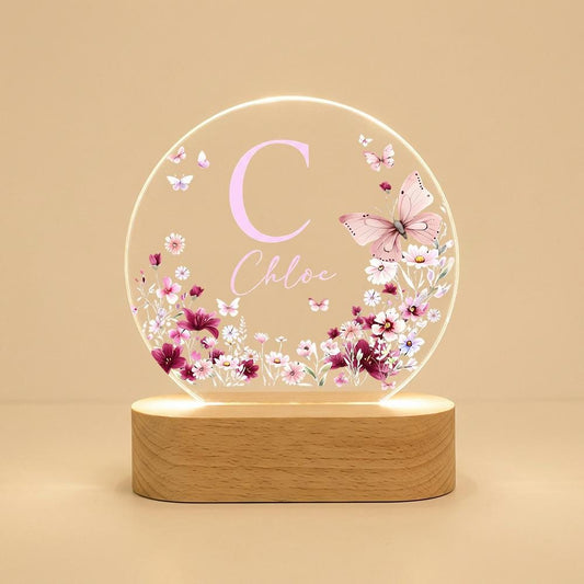 Acrylic LED night light with butterfly floral monogram, personalized name bedside lamp, nursery room decor, custom initial plaque gift